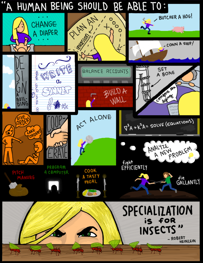 This is a quote by Robert Heinlein in Time Enough for Love and depicts the qualities of a Competent (Wo)Man. To me this quote says it all.