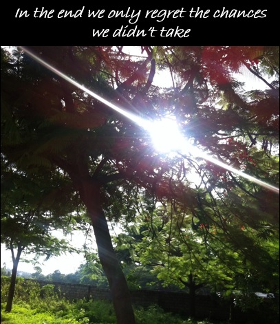 Life is too short to think of regrets. Life is about taking chances. Take that leap of faith, those 20 seconds of courage to speak your mind, just do it when you get a chance and believe in yourself.