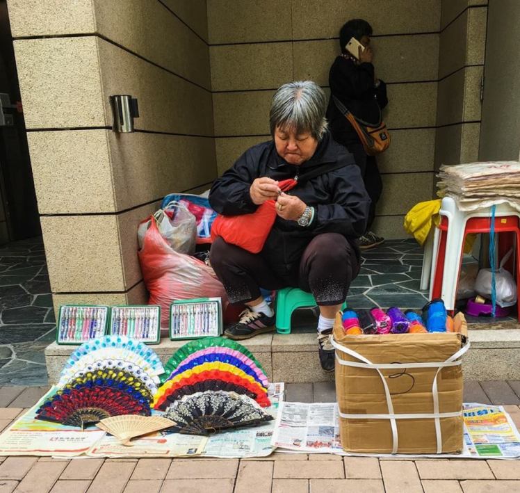 While walking towards the Pebble Bay beach in Hong Kong, I spotted this lady. Something about her intrigued me. She was engrossed and also wanted to sell those knick knacks to the passersby. It was a juxtaposition as I saw it but then, who said life was simple?