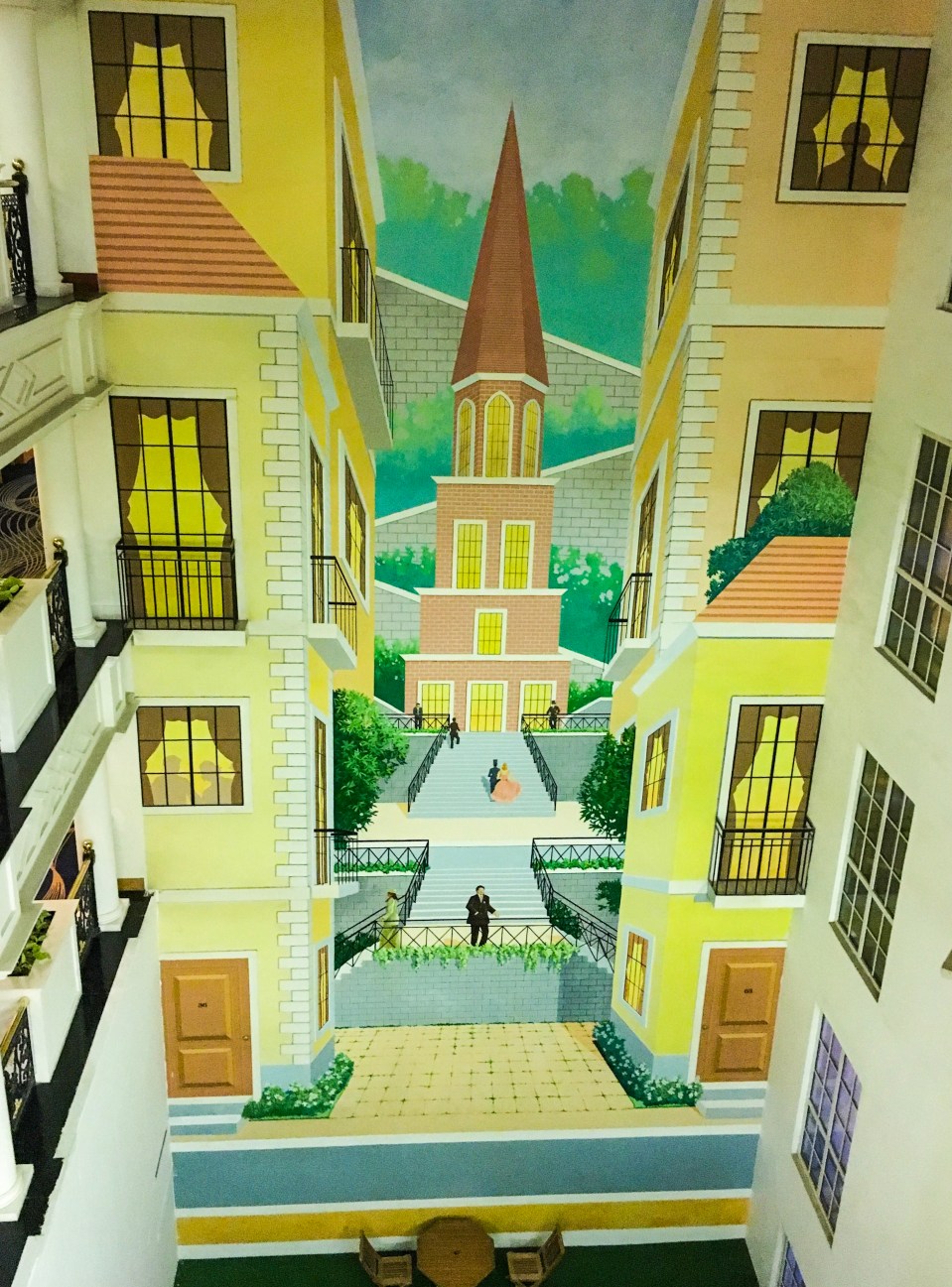 I spotted this wall art at a hotel in Chennai. I was staying on one of the higher floors and hence the view was clearer. While there are a few things that could be better, I liked the European feel to the art. The chapel, the couple climbing up the stairs, man in the window and other things. Also, the artist did try to make this look like a 3 D art.