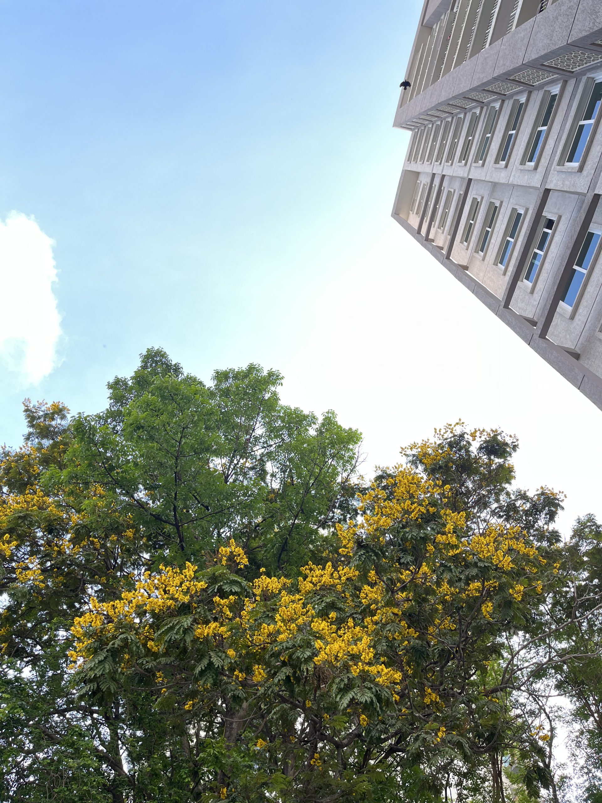 As much as I love trees, I also love elements of nature coming together. Look at the sky, the tree, the flowers and then the man made skyscraper. Did you also notice that bird?