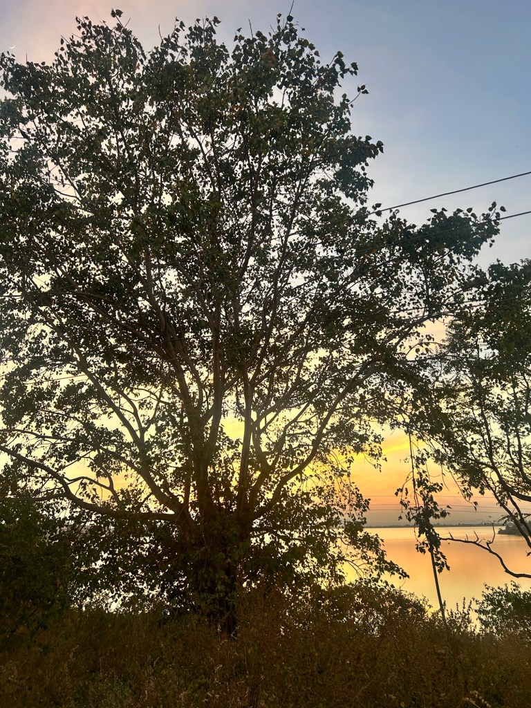 So this is a tree I clicked just day before on Ozarkhed dam in Nashik, Maharashtra, India. We were driving back to Bangalore and VT wanted to see this dam. We pulled aside, got off the car and the scene was mesmerising. The sky, the colors, the reflection in water and then this tree. I didn’t get enough time to identify it and Google these tells me everything is Ficus. And that’s hard to trust. But here I am with all the things in these two photos that bring me joy.